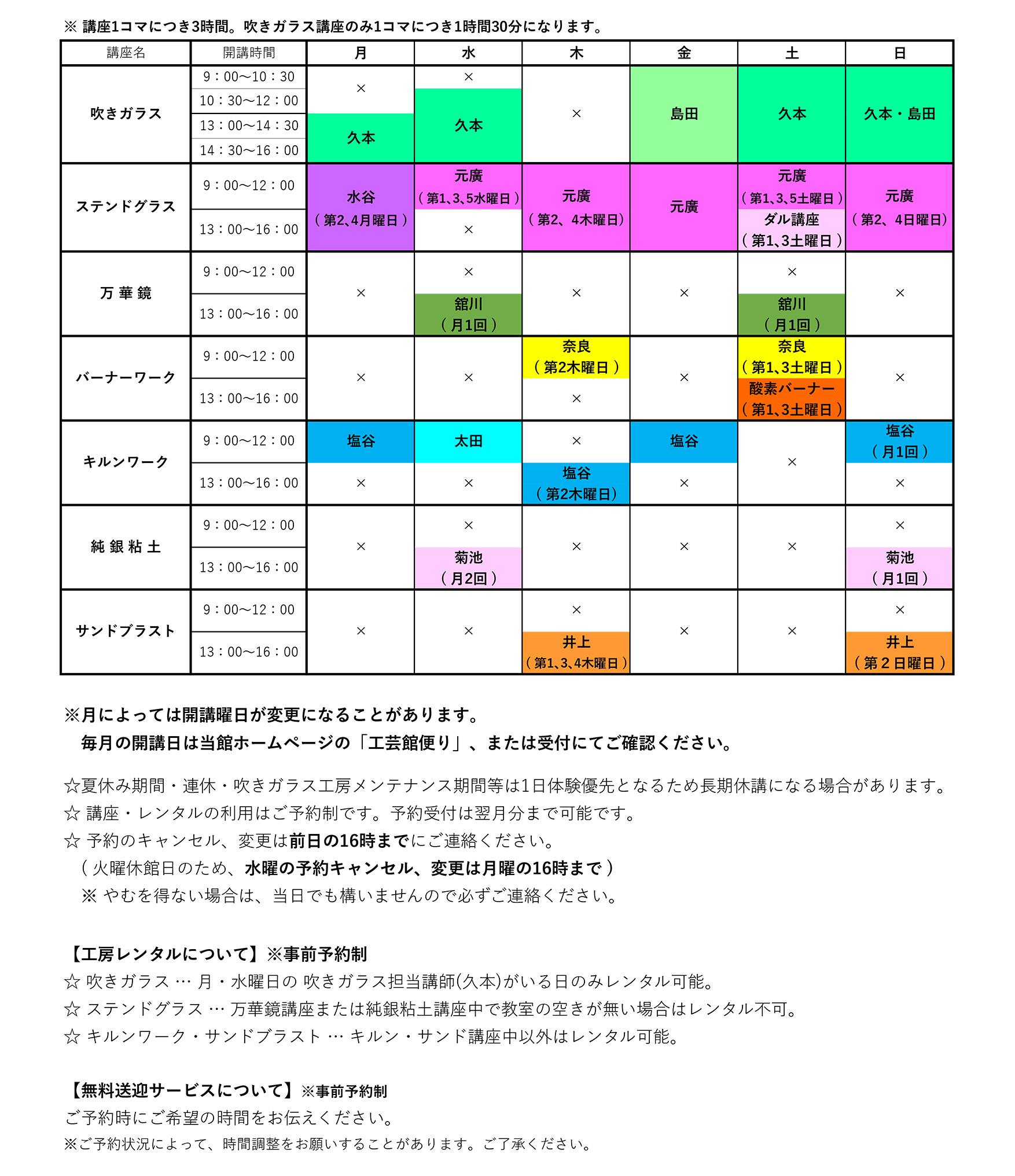 - 講座、レンタル工房をご利用の方には、講座・レンタル会員証を発行いたします(無料)。講座料・レンタル利用料や材料費の支払い時に必要です。必ずご持参ください。