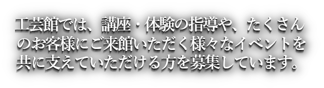 - 吹きガラス体験および講座の講師 (講座、体験、イベントなどを通じて幅広い世代にガラス工芸の魅力発信、ガラス工芸文化の発展に貢献していただける方)